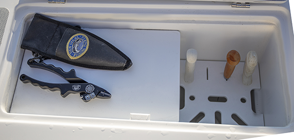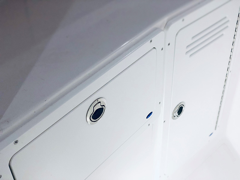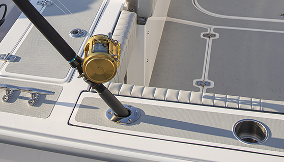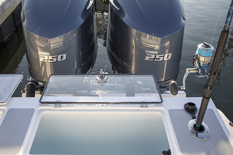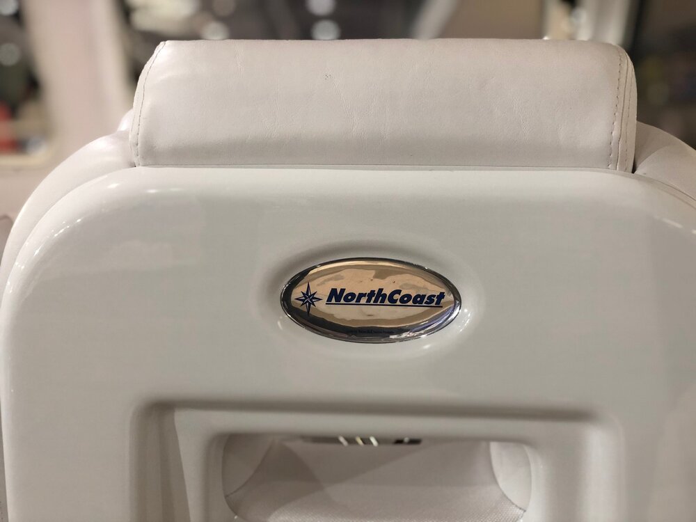 LED Cockpit Floodlight · Courtesy lights P&S · Walk through transom door portside · 26 Gal transom Blue Live well w/ light & clear lid · Transom compartment with knife holder/cutting board · (4) Custom Stainless rod holders · (2) Cup holders · (2) 139 quart Macerated Fish boxes in deck · Under gunnel rod holder storage P&S (6) · Cockpit bolster package w/NorthCoast logo · Saltwater wash-down · Center access cockpit hatches w/ gas assisted struts · Full cockpit perimeter gutter system w/oversized scuppers · Armstrong Swim ladder