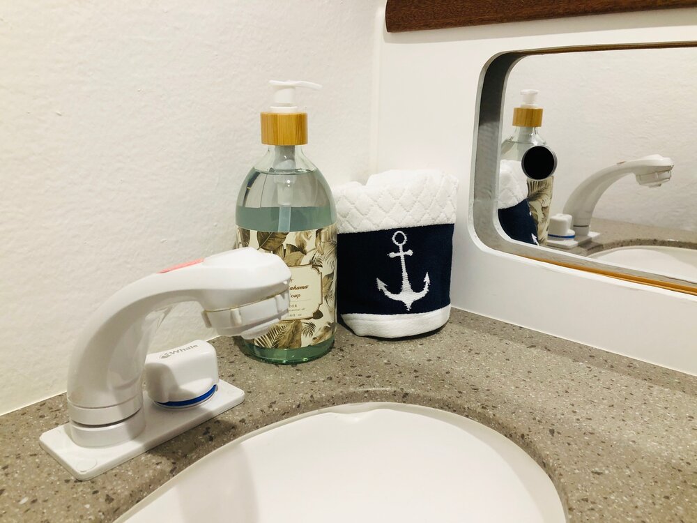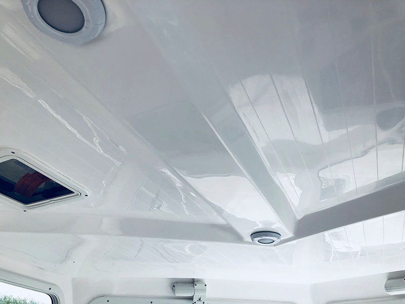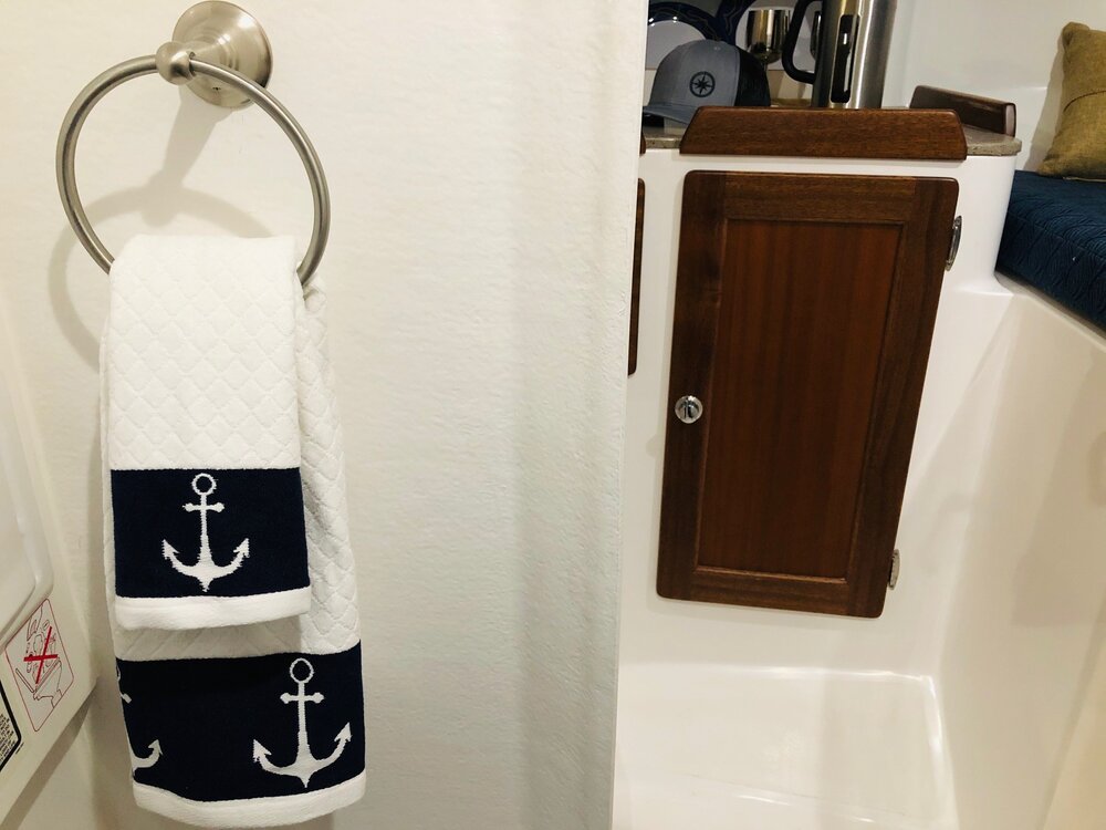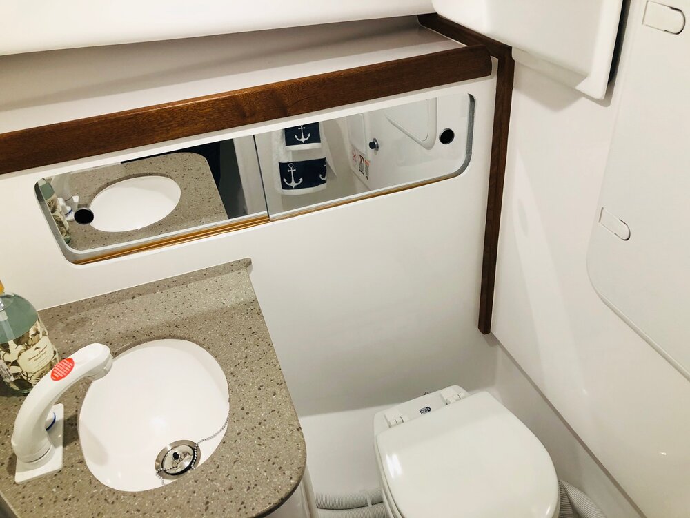 Marine Head macerated overboard discharge and 11GAL holding tank · Vanity sink, w/pull out shower sliding door storage/shelves · LED cabin dome lights (day/Red night) · Courtesy light