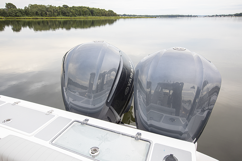 12 Year structural hull warranty · “No wood” construction · White hull w/ boot stripe · Cored deck and molded hull liner w/two tone molded non-skid (Choice of Gray or Tan) · Foam filled composite grid stringer system · High density foam cored transom · Armstrong dual engine bracket · High impact rub rail w/ insert