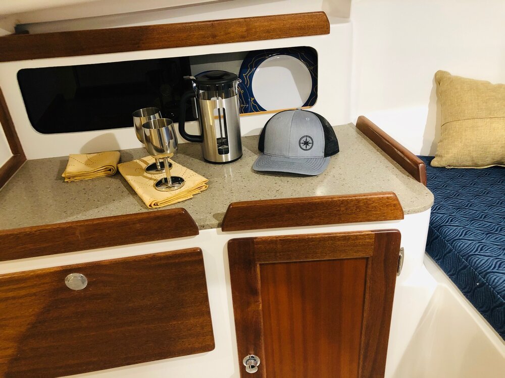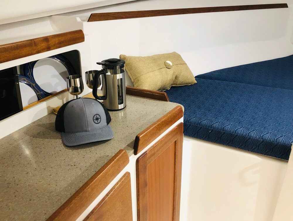 75” Berth length with 40” sitting headroom & cushions · Storage lockers and pull out drawer to port (optional Galley package available) · Locking Companionway door · Opening ports w/ screens (2) · Forward hatch w/ screen Bomar 19×19 · LED cabin dome lights (day/ Red night)