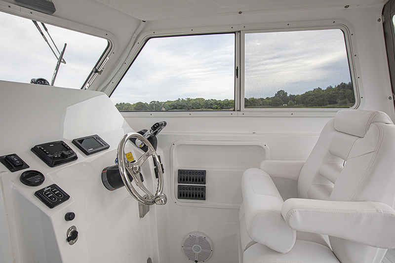 Custom fiberglass windshield frame · Opening windshields & sliding side windows w/ screens · Wipers w/multifunction switch P&S · EDSON SS steering wheel · Horn · Todd Helm and Companion seats P&S · Insulated 113 quart Cooler under cushion aft of companion seat·(2) Tackle boxes P&S w/tool drawers · (2) Folding cup holders · LED navigation lights, courtesy lights & dome lights · Ritchie compass @ helm · DC panels at helm w/USB & DC plugs · LEMCO Trim tabs w/ LED position indicators · Seat cushions P&S- aft of seats · Phone, wallet, key bins outboard of helm seats, P&S Custom aft canvas enclosure w/roll up door