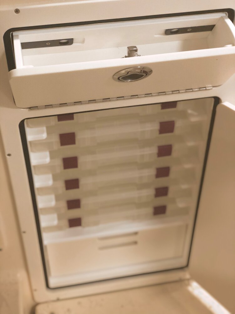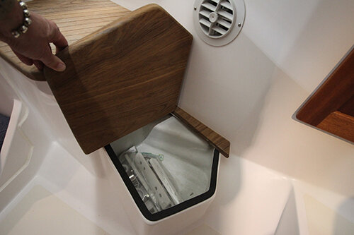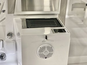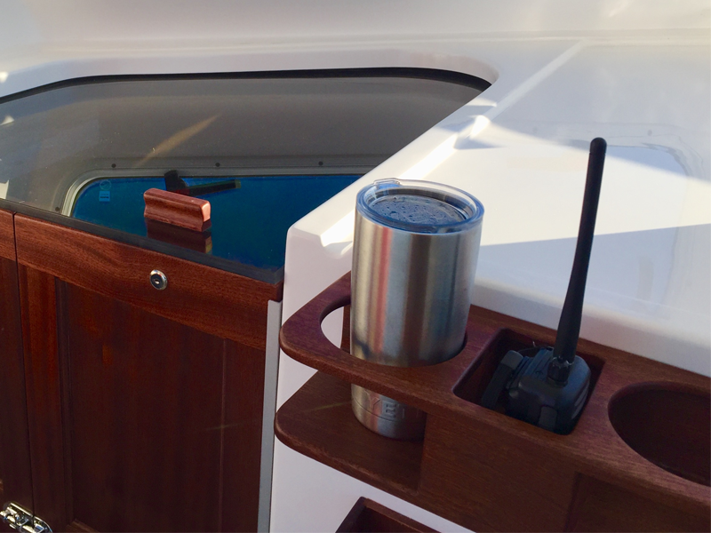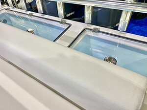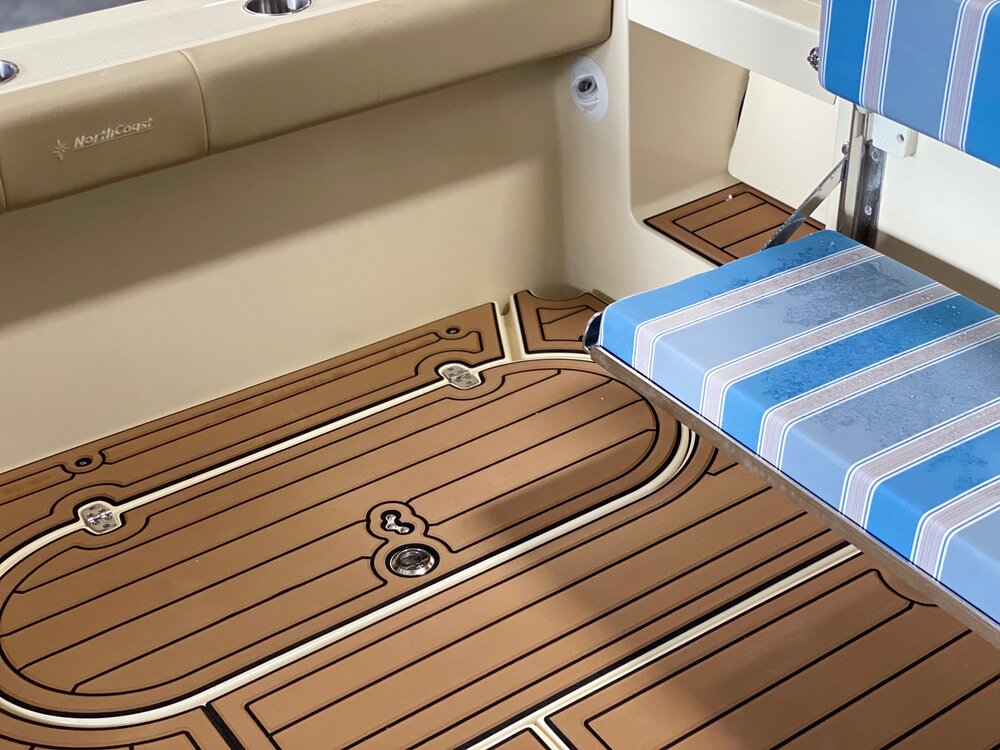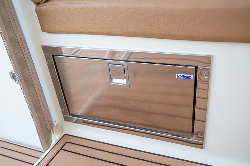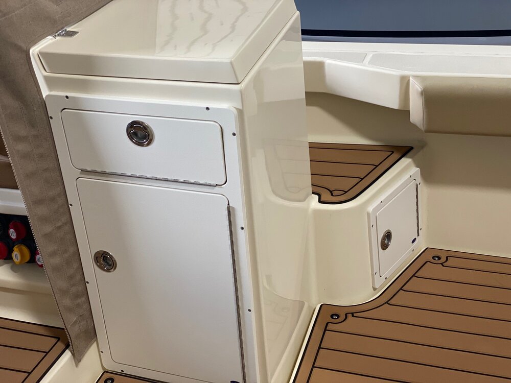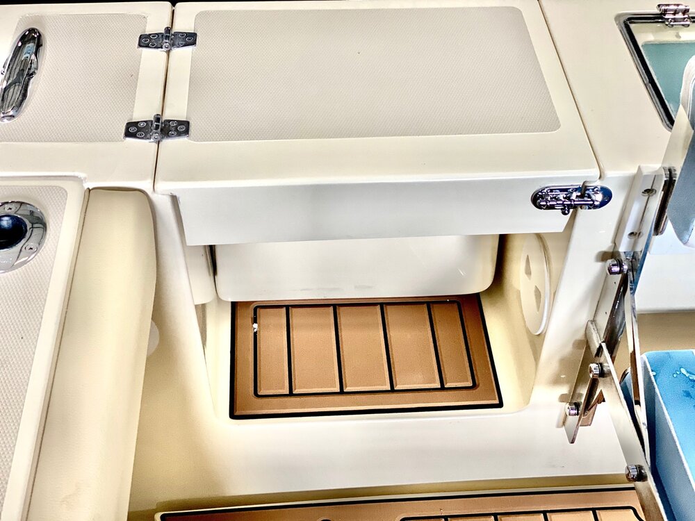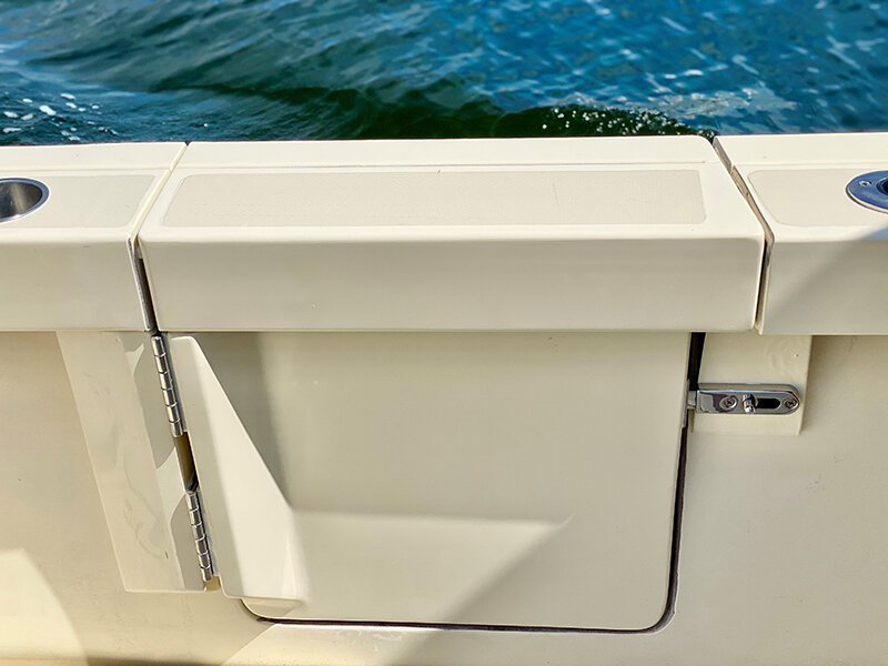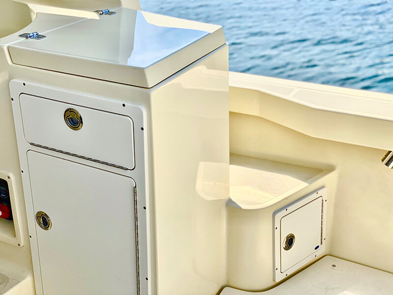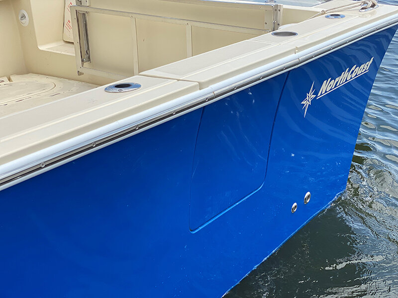 Kenyon Cockpit Grill w/ (2) Drawers for tools, flatware, etc. · Molded Sink w/(6) Tackle boxes below · Portside Tuna Door · Custom stainless rod holders (4) · Cup holders (4) · Cockpit bolster package w/ NorthCoast logo · Fresh water shower at transom · Saltwater wash down at transom · Storage in steps to fore deck P&S · Removable cockpit sole · Center access cockpit hatches to mechanical area · 26 gal Blue Live well w/ light & clear lid · 19 gal Blue Live well w/ light & clear lid · 58 gal Macerated Fish Boxes (2) · Step-thru transom w/door to Starboard · Full cockpit perimeter gutter system w/ over-sized scuppers · Swim ladder on transom bracket