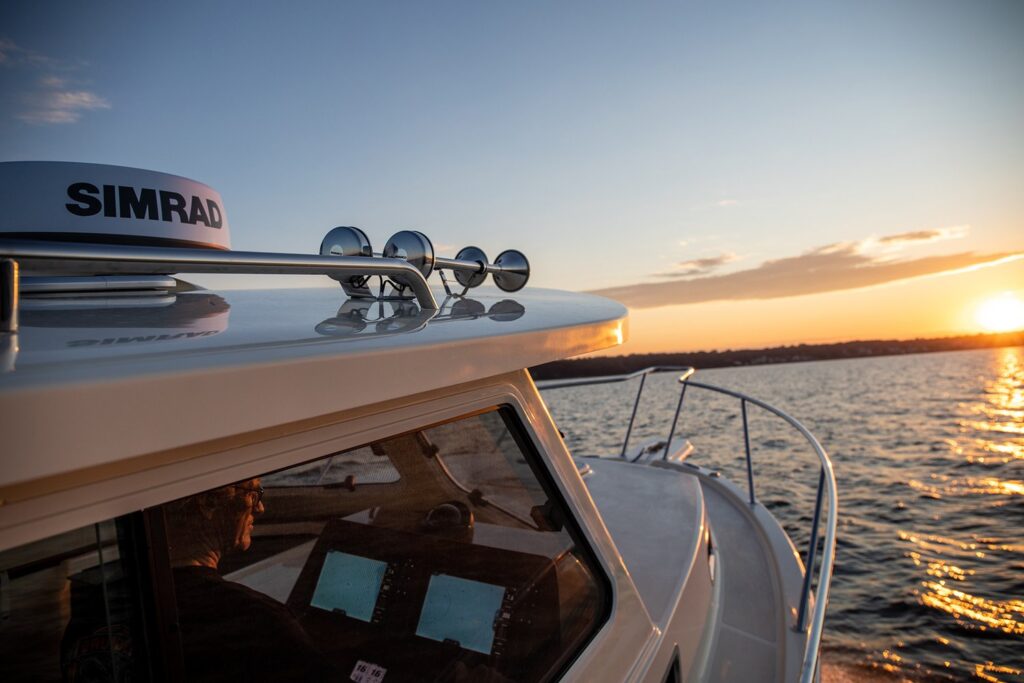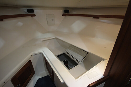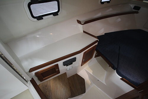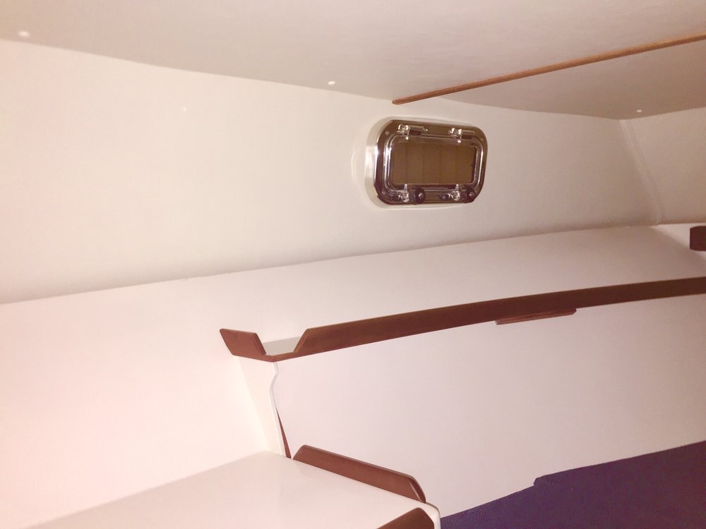 Double berth to stbd w/ storage below · Removable insert & step to port · Storage lockers to port · 6’8” athwartship aft berth below helm area · Opening ports w/ screens (4) · Fwd hatch w/ screen · LED cabin dome lights (day/night) · LED reading lights: two at each berth