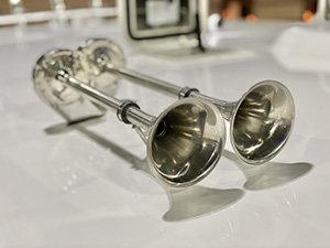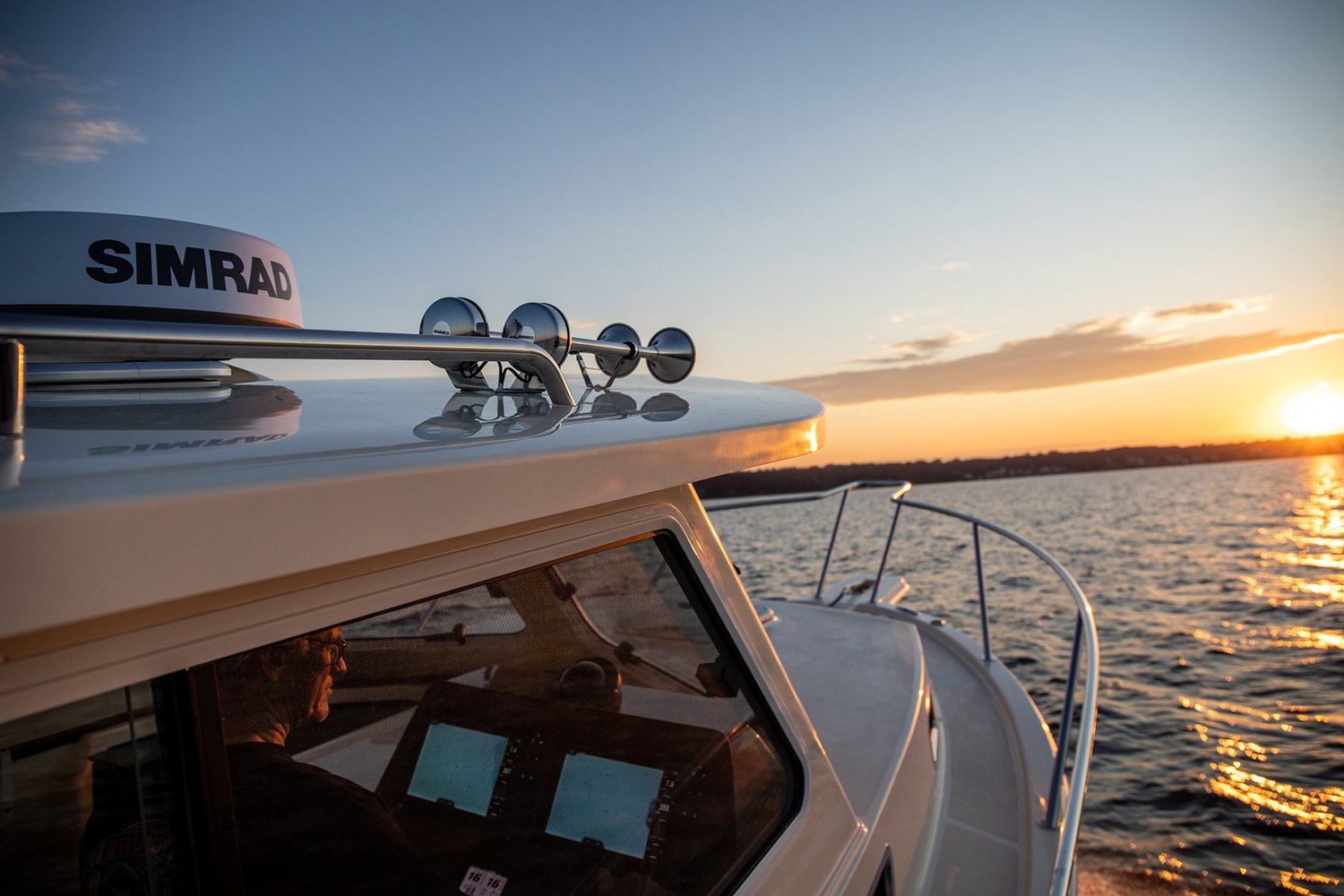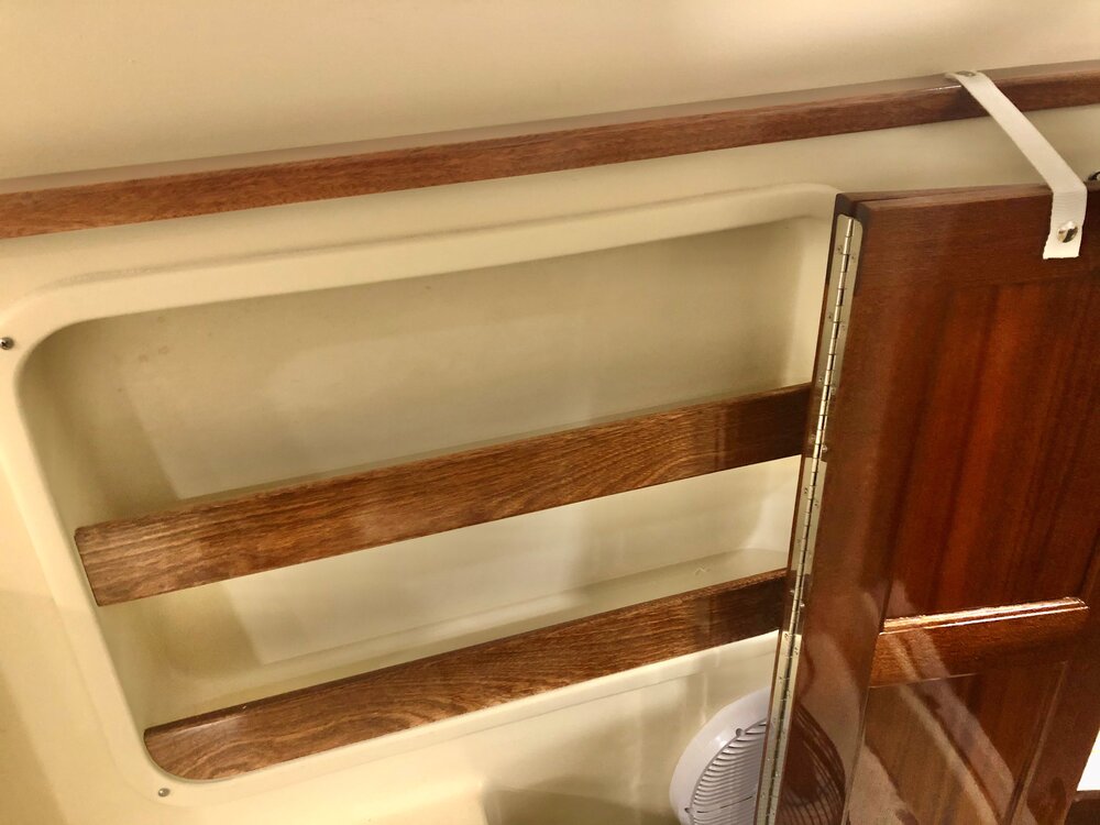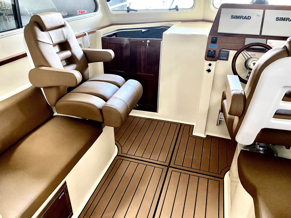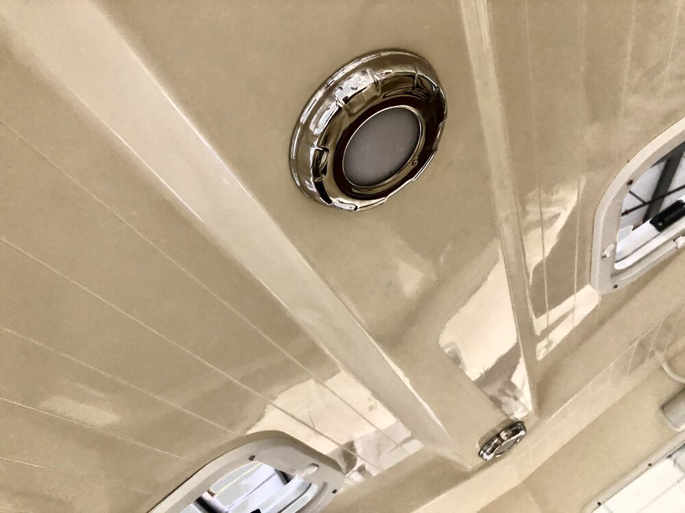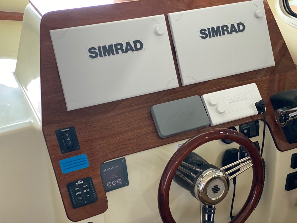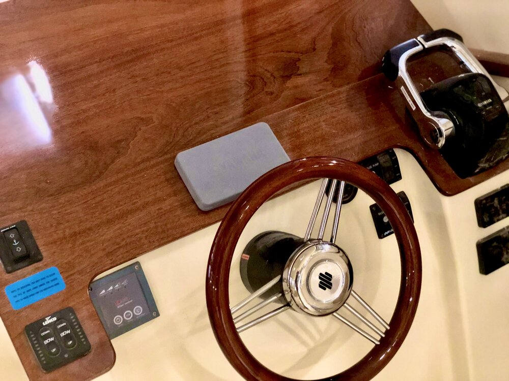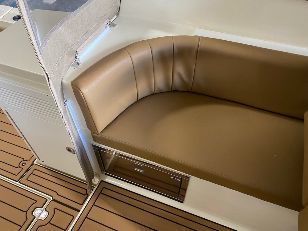 · Custom fiberglass windshield frame · Coated opening windshields · Sliding side windows w/ screens · Pantograph wipers w/ multifunction switch (P&S) · Vent hatches on hard top · LED navigation lights · Courtesy lights & dome lights · Dual trumpet horn · Ritchie compass @ helm · DC panel at helm w/ USB & DC plugs · Trim tabs w/ LED position indicators · WET SOUNDS entertainment system · Stereo cabin speaker system · TODD Ladder back helm seats P&S · Seating aft of helm seat is insulated · Seating aft of companion seat is storage · AC/DC Refrigerator Drawer to Port · Phone, wallet, key bins · Custom aft canvas enclosure with removable large windows to P&S and center roll-up door