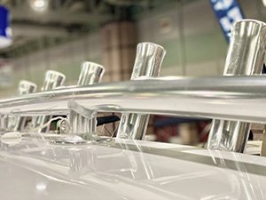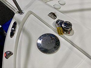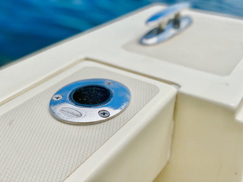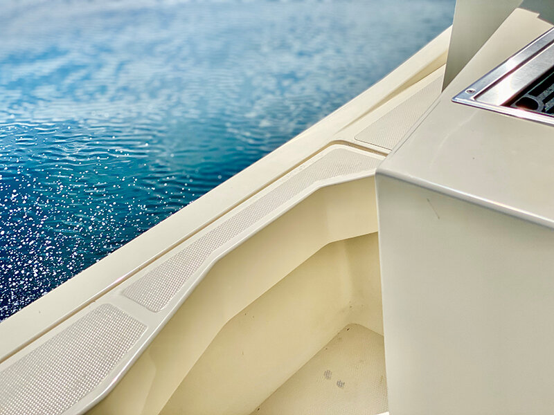 · Molded bow sprit w/ roller & chain lock · 316 1.25” Stainless steel bow rail · (6) 316 Stainless steel hand rails · Stainless steel deck hardware · Anchor windlass w/ fwd foot controls