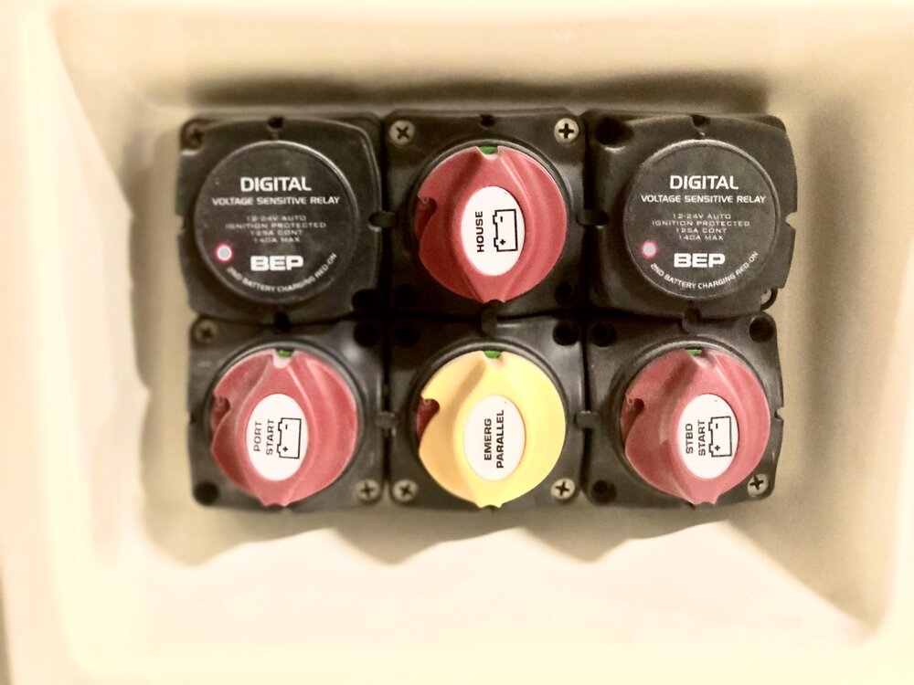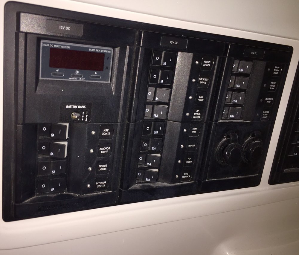 Three battery system AGM31 · Pressure cold water system · Shore power AC/DC panel at helm · USB & DC plugs · 110V GFI outlet in head · 110V outlets in cabin (3) · Shore power chord 50’ · Battery charger 12v 20AMP · Inverter 3000w · Automatic bilge pumps Fwd 1100 & Aft 2000