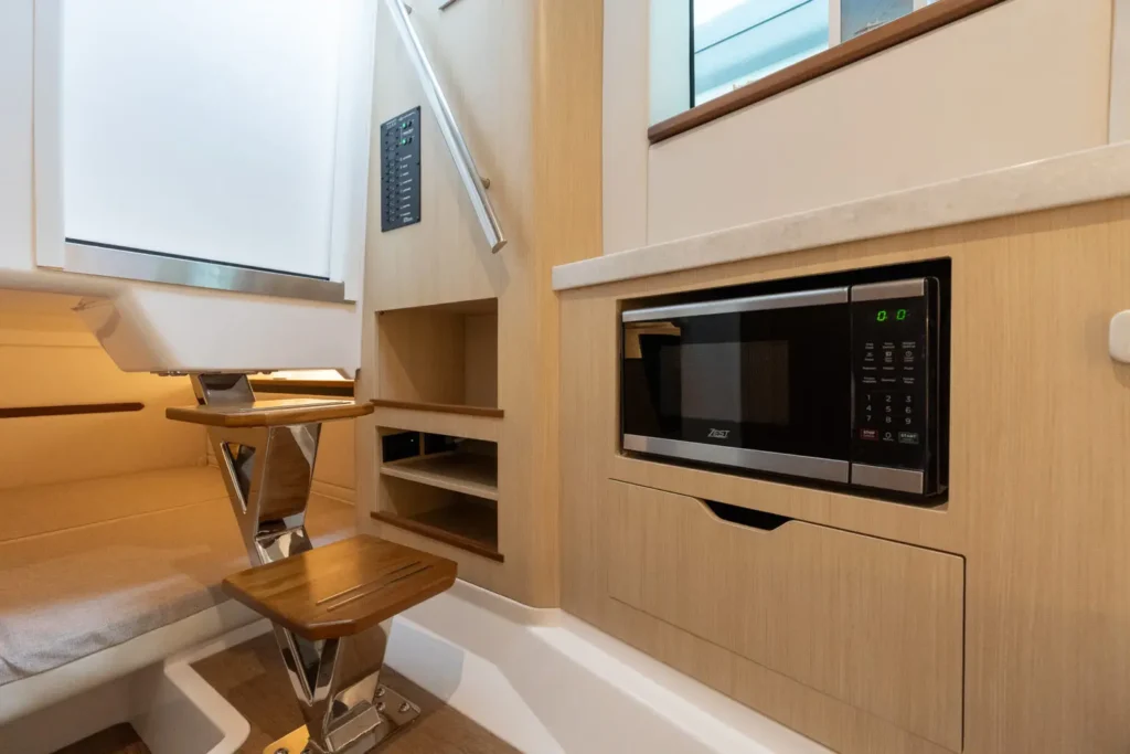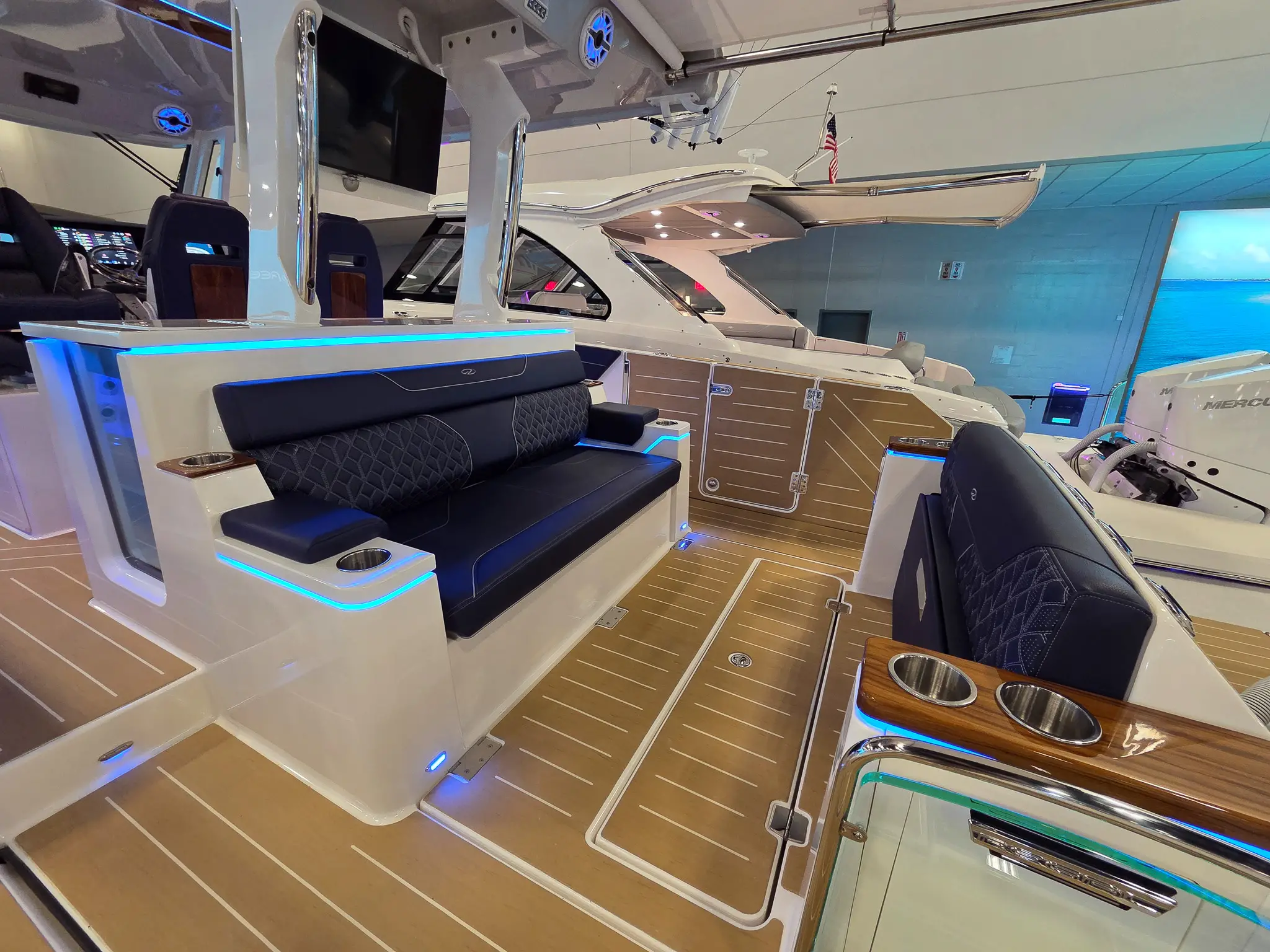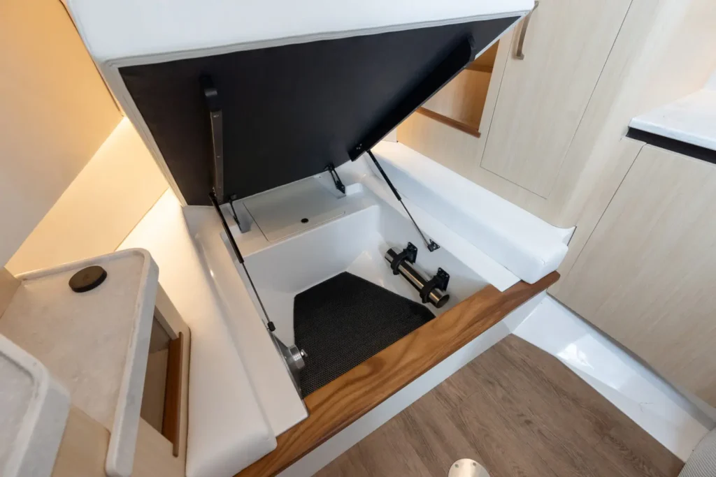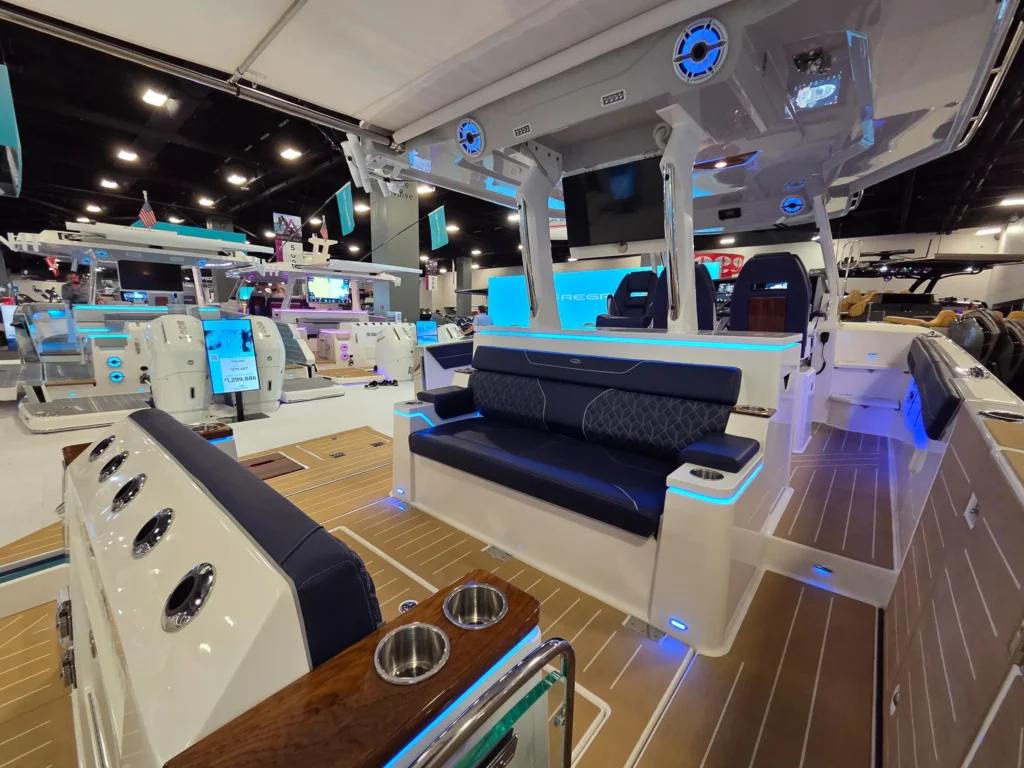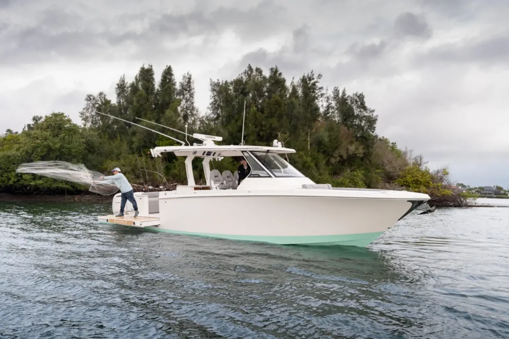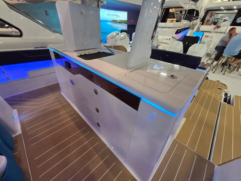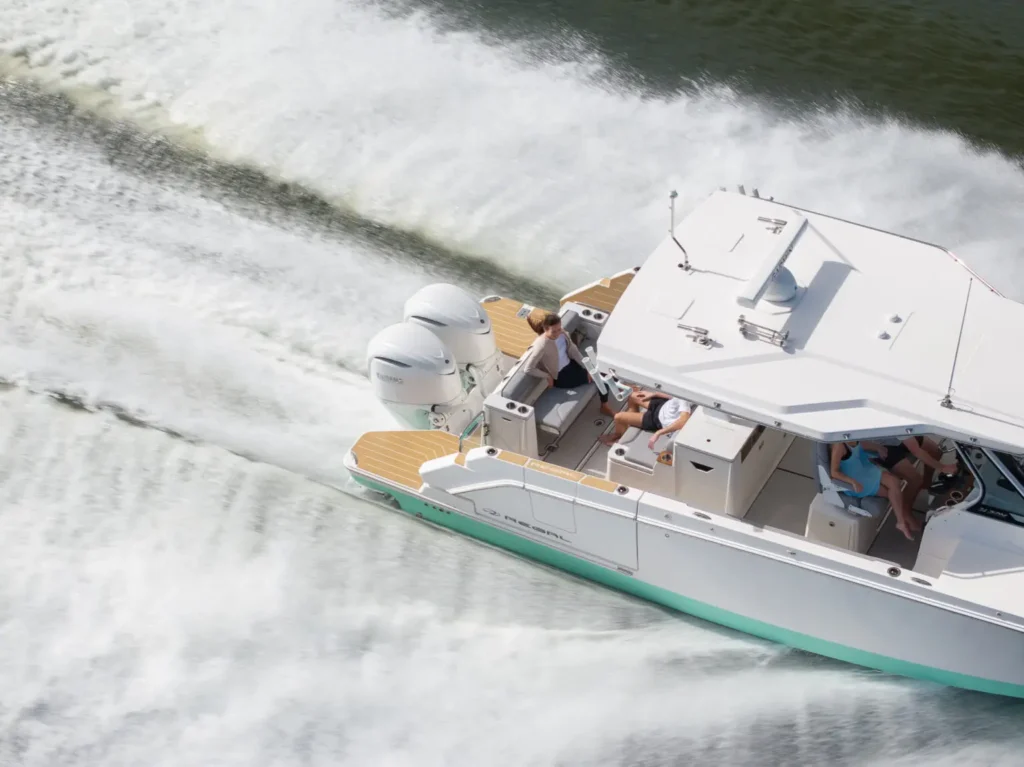 Dual Terrace Doors lower and turn the cockpit into the social center of the boat, creating more space and easy in-and-out access for swim days, sandbar hangs, and water toys.