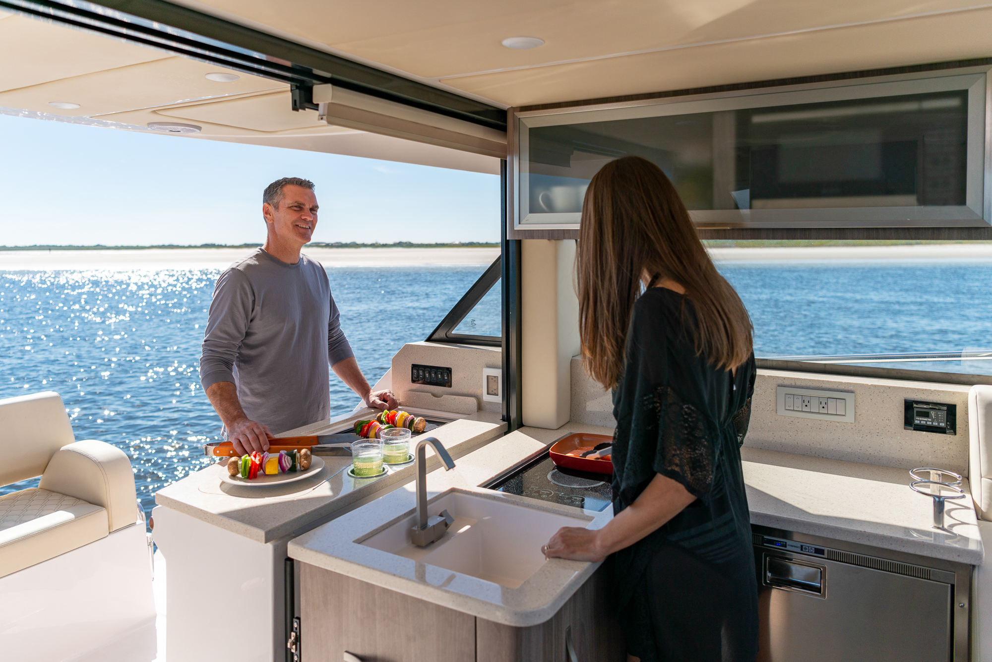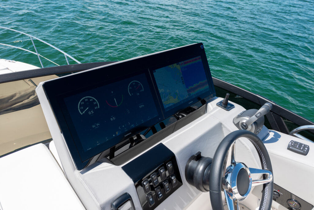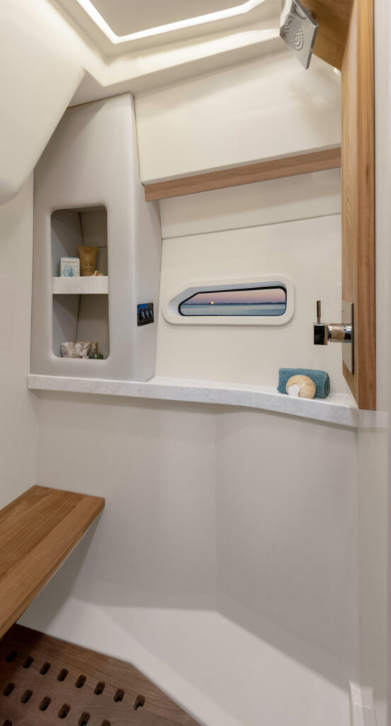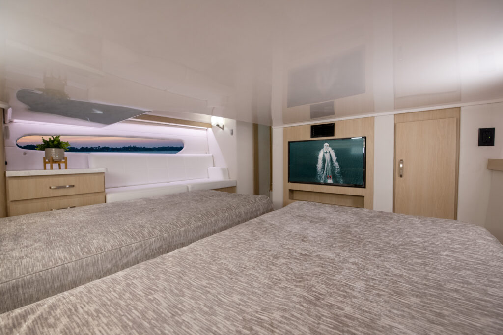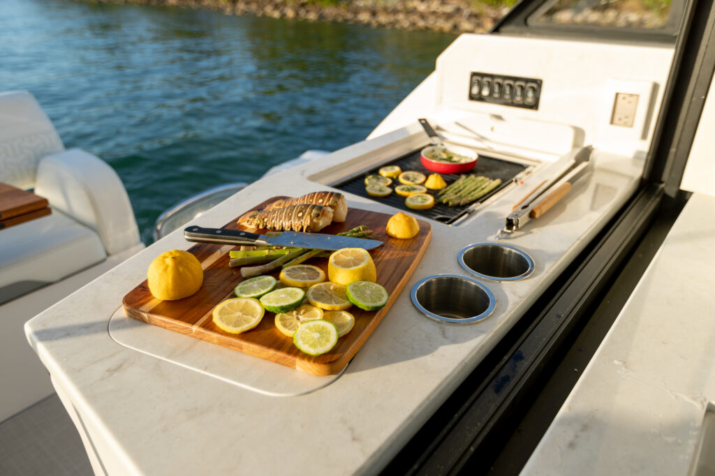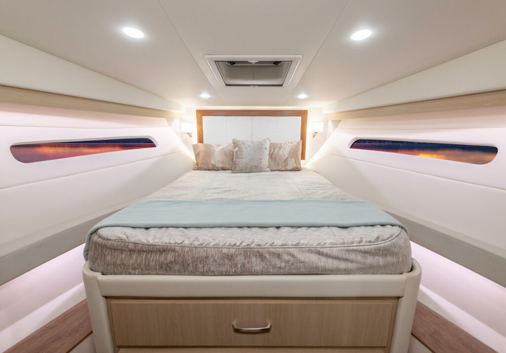 At the peak of the midday sun you will retire to the sheltered aft-cockpit, where a lengthy and languorous transom sofa will seat up to four guests around a pop-up cocktail table, while integrated cup-holders keep your drinks within easy reach. A chunky wet-bar station back here doesn’t just boast chilled storage, a sink and solid, marble-effect work surfaces but also features an electric smokeless grill where you will barbecue fresh lobster tails and Wagyu steaks for luxury surf-and-turf out on the water. Fusion Stereo speakers dotted throughout the yacht and linked to the helm via Bluetooth, meanwhile, provide a magical soundtrack to your days at sea.
