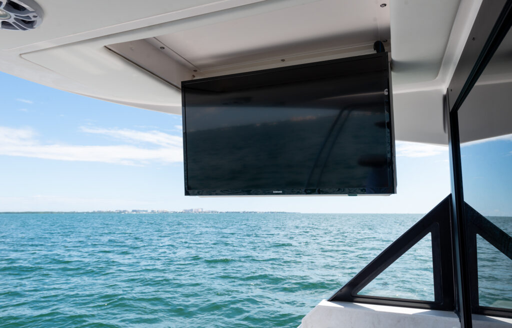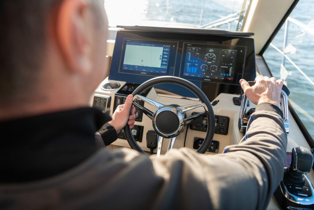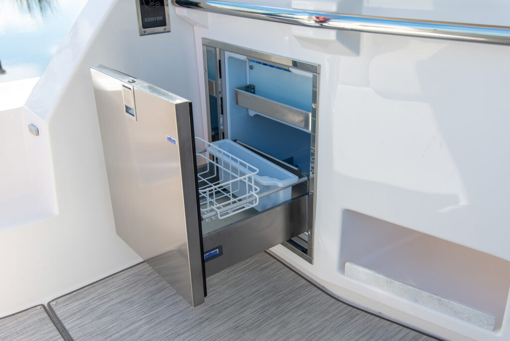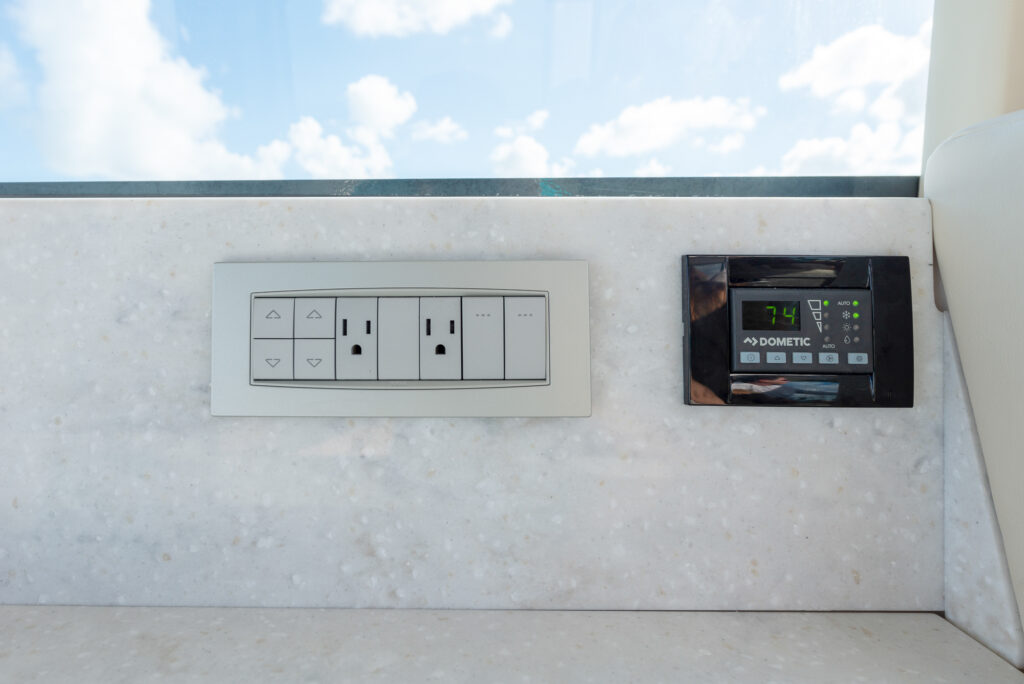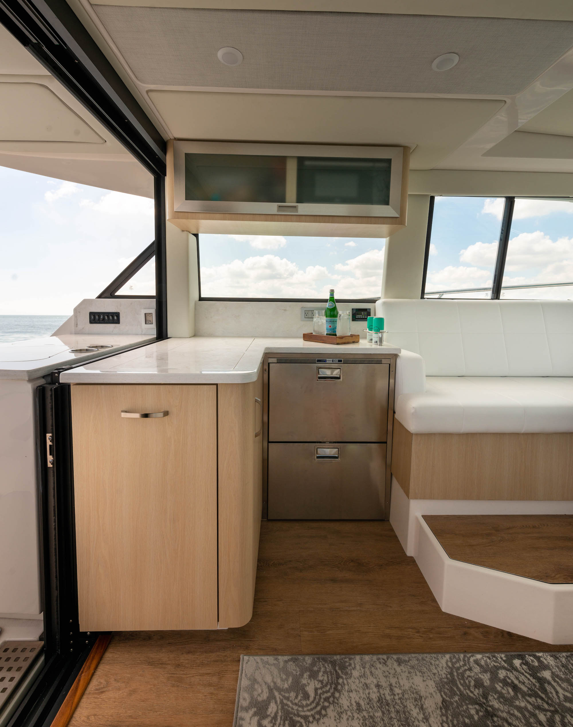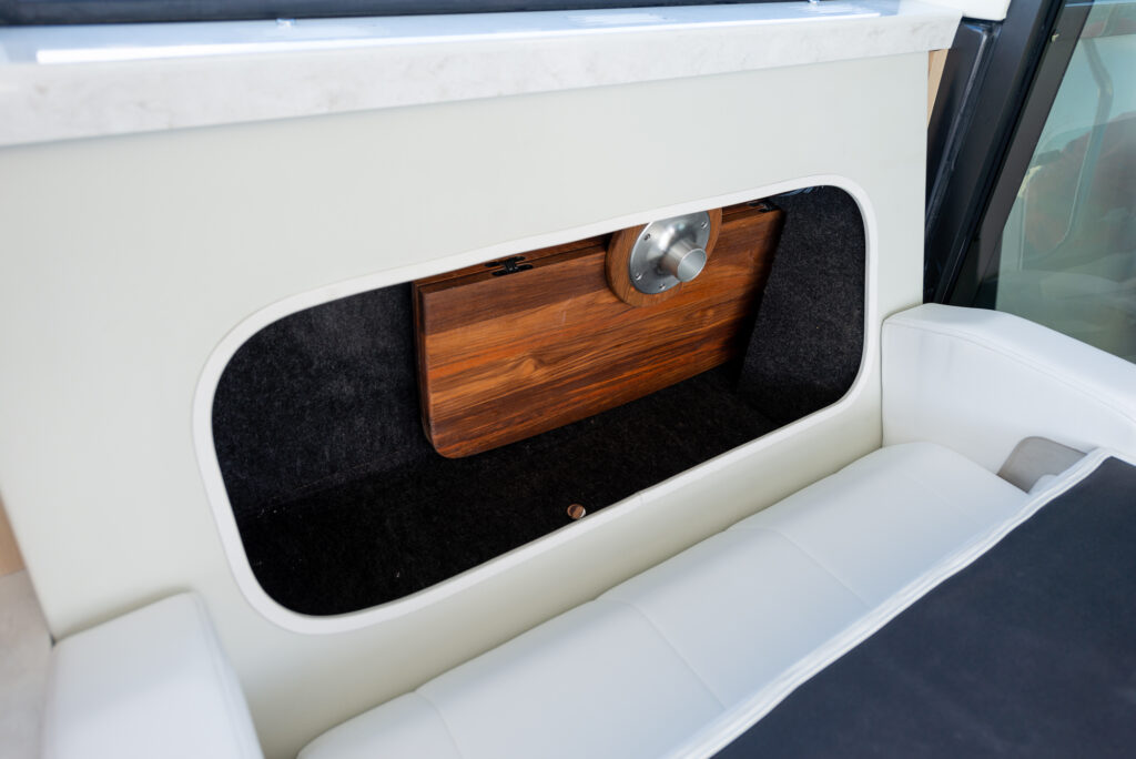 At the peak of the midday sun you will retire to the sheltered aft-cockpit, where a lengthy and languorous transom sofa will seat up to four guests around a pop-up cocktail table, while integrated cup-holders keep your drinks within easy reach. A chunky wet-bar station back here doesn’t just boast chilled storage, a sink and solid, marble-effect work surfaces but also features an electric smokeless grill where you will barbecue fresh lobster tails and Wagyu steaks for luxury surf-and-turf out on the water. Fusion Stereo speakers dotted throughout the yacht and linked to the helm via Bluetooth, meanwhile, provide a magical soundtrack to your days at sea.