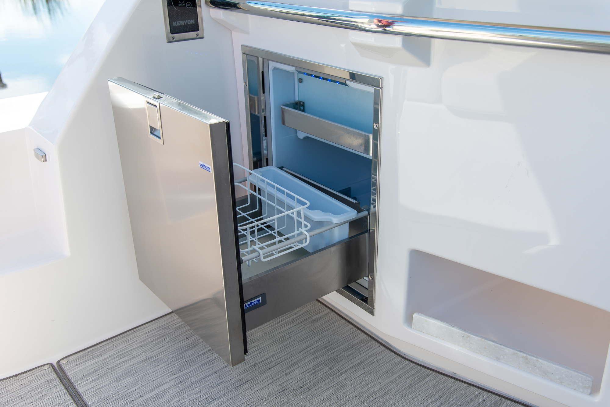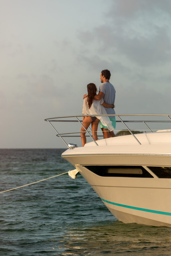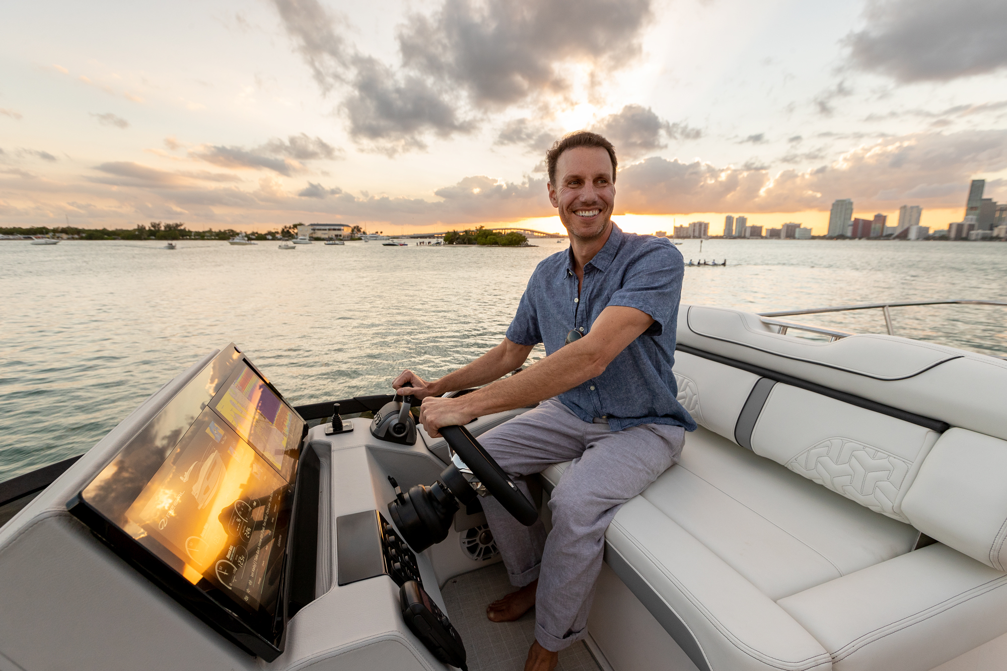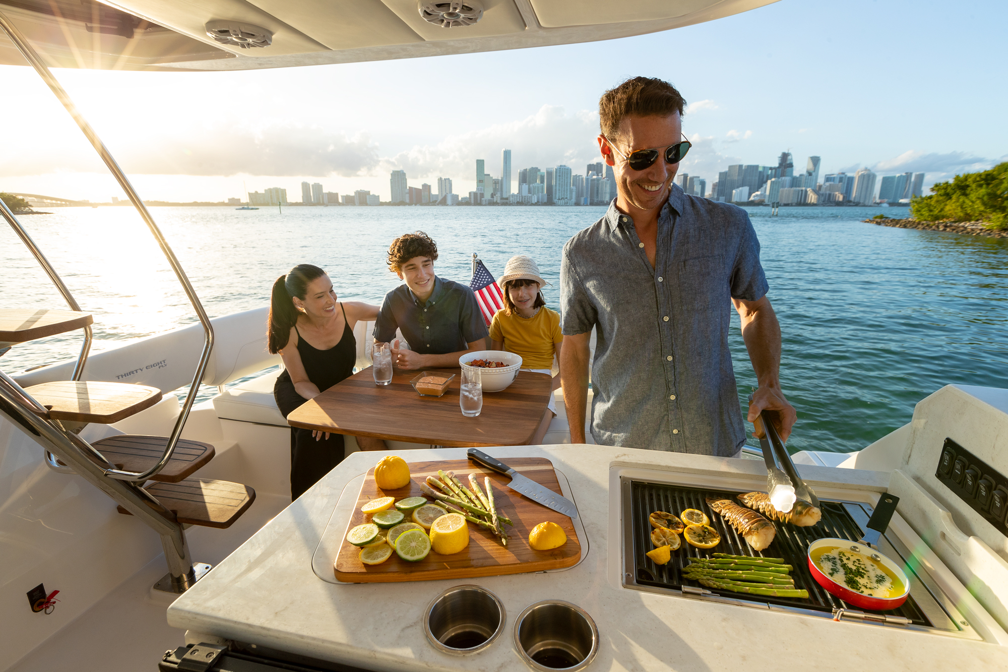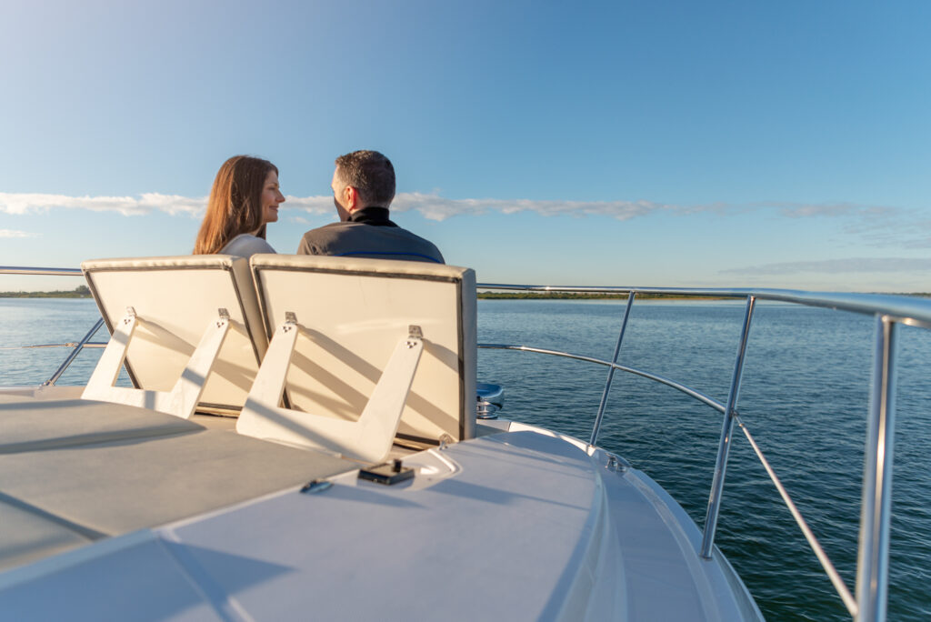 At the peak of the midday sun you will retire to the sheltered aft-cockpit, where a lengthy and languorous transom sofa will seat up to four guests around a pop-up cocktail table, while integrated cup-holders keep your drinks within easy reach. A chunky wet-bar station back here doesn’t just boast chilled storage, a sink and solid, marble-effect work surfaces but also features an electric smokeless grill where you will barbecue fresh lobster tails and Wagyu steaks for luxury surf-and-turf out on the water. Fusion Stereo speakers dotted throughout the yacht and linked to the helm via Bluetooth, meanwhile, provide a magical soundtrack to your days at sea.