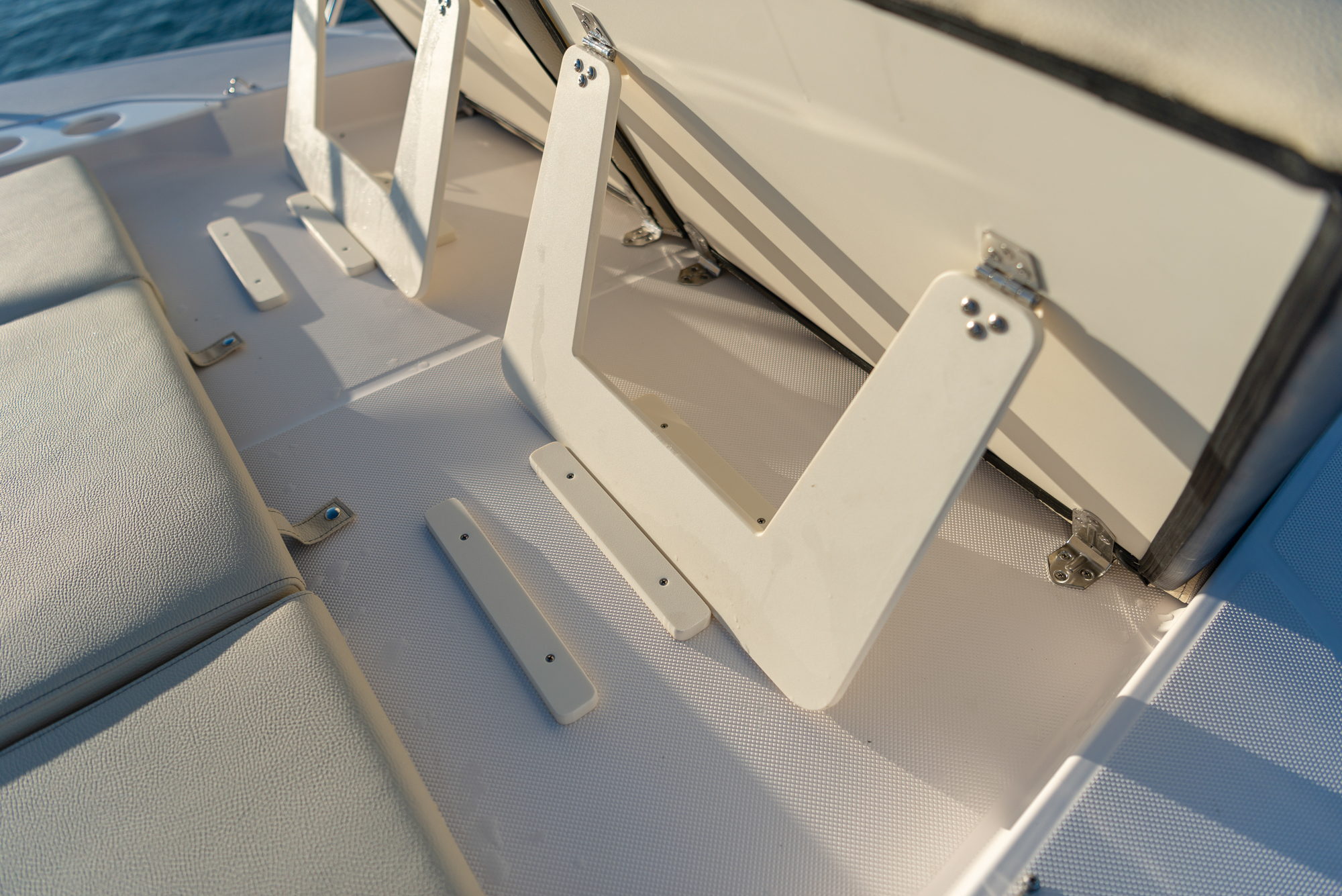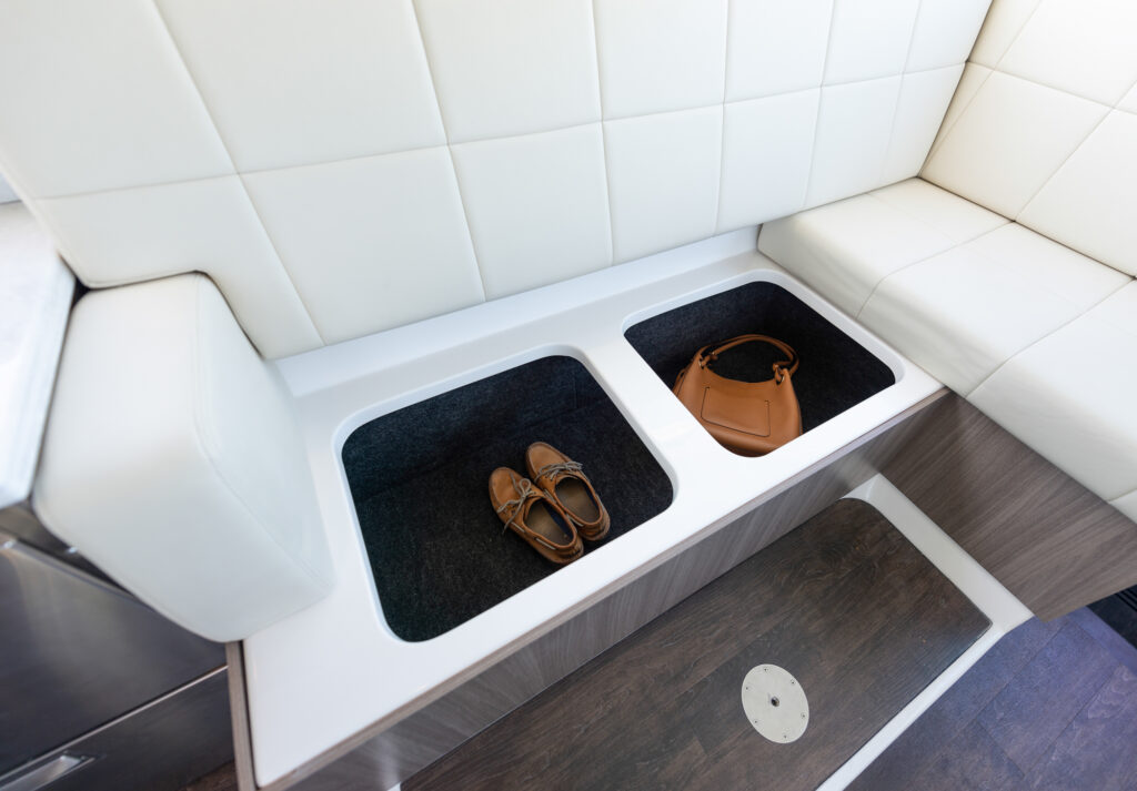A mansion may come with significant acreage, but on this yacht the entire ocean is your backyard. Access to the water is best enjoyed to stern, where a full-beam, extended Power Platform can be raised and lowered into the water for afternoon swims. Hidden storage throughout the yacht means you can store your watersports gear for a spot of snorkeling, while a capacious transom lazarette hides enough room for Seabobs or even wakeboards. Accessed via a set of port-side steps, the bathing platform is lined in non-slip Seadek for a secure experience, while it also features a swim ladder for simple reboarding.