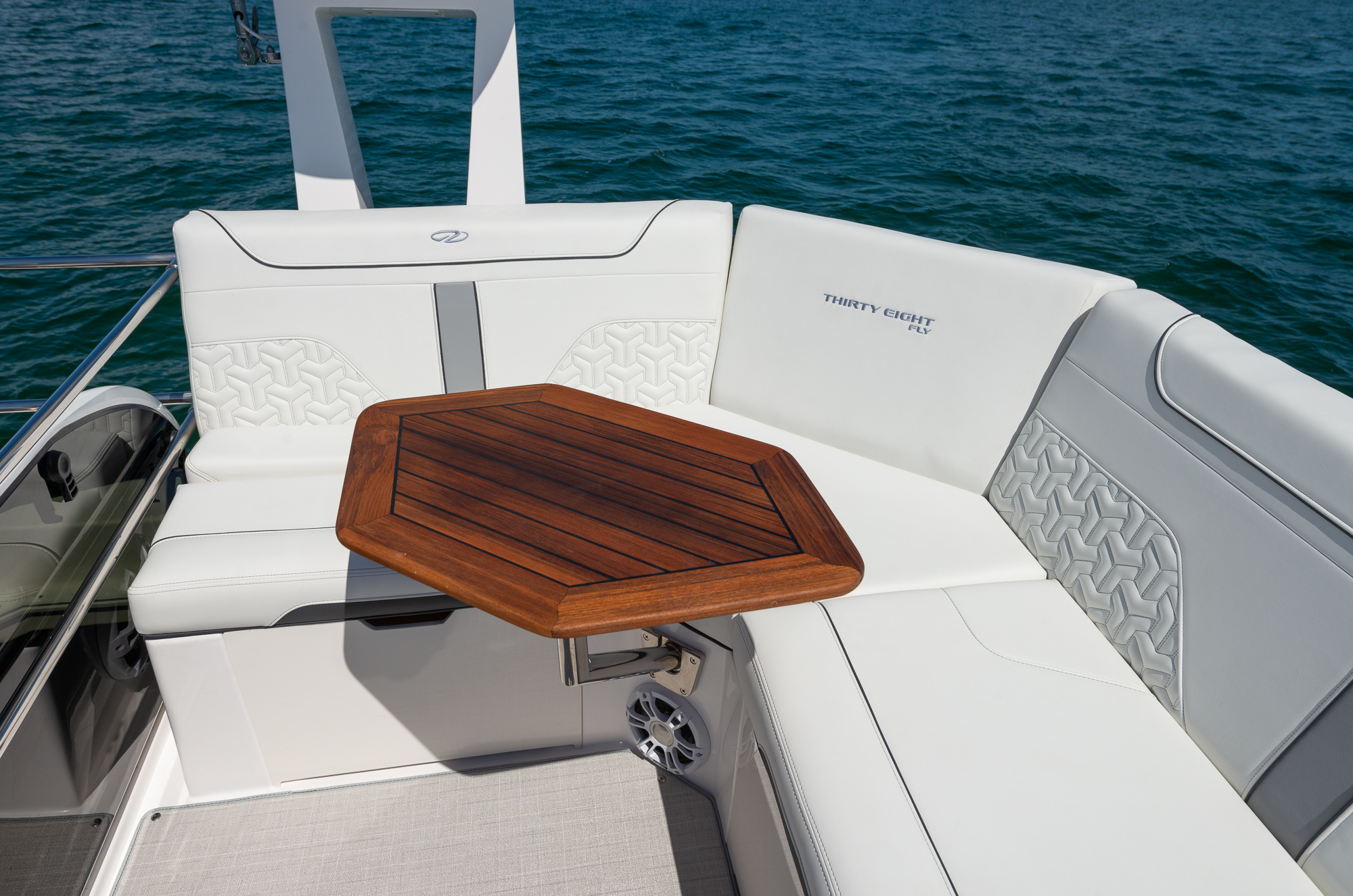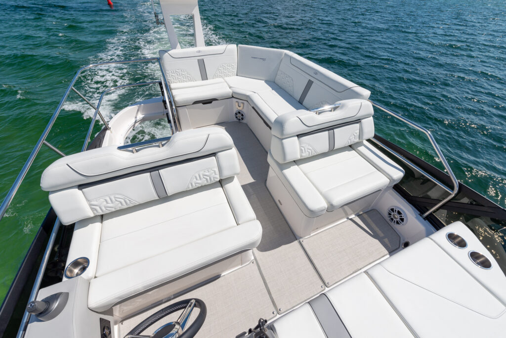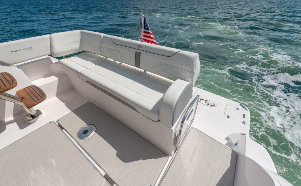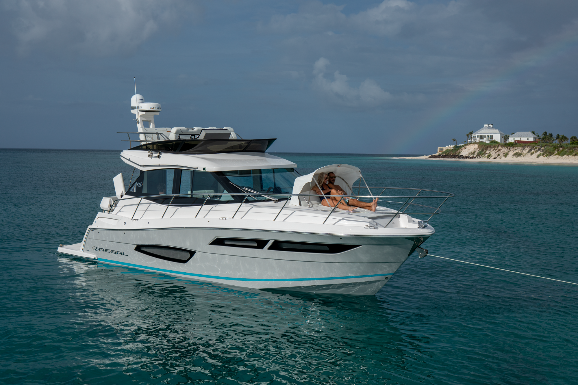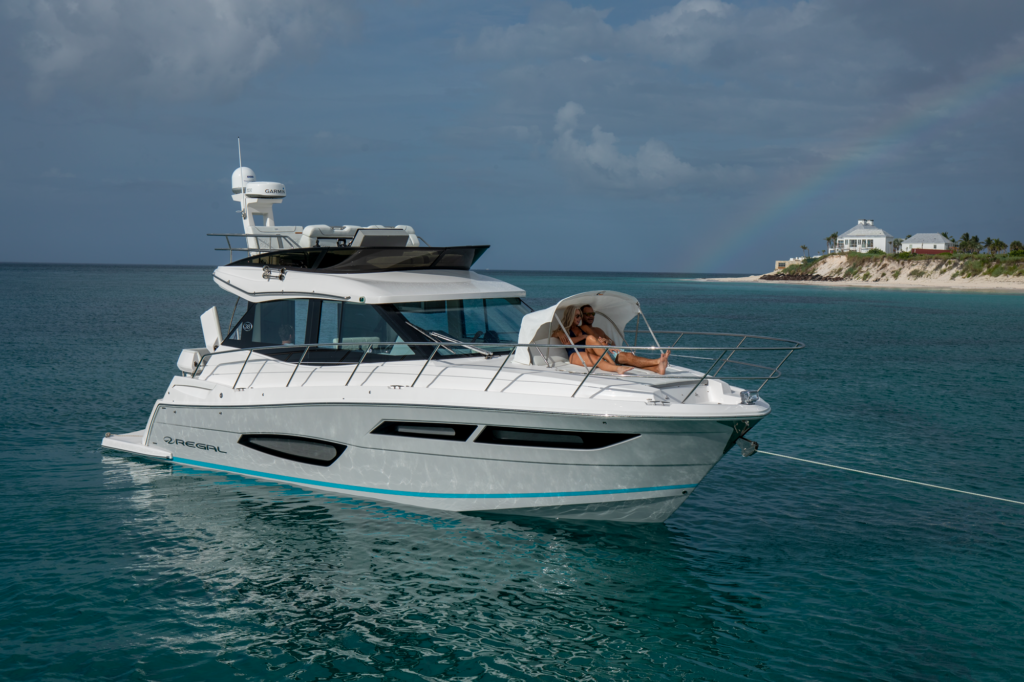 This watercraft, however, is quite a sight in itself. Possessing the curvaceous and streamlined looks that have made Regal Boats so sought-after in recent decades, the 38 Fly combines the latest in modern naval architecture and aerodynamic lines with a harmonious nod to the very best of Regal’s brand heritage. Pick a custom gel-coating to give your vessel a livery in sparkling Tahiti Beach White, or add a shock of color in the form of a Flame Red bootstripe, bound to catch the eye as you cruise.