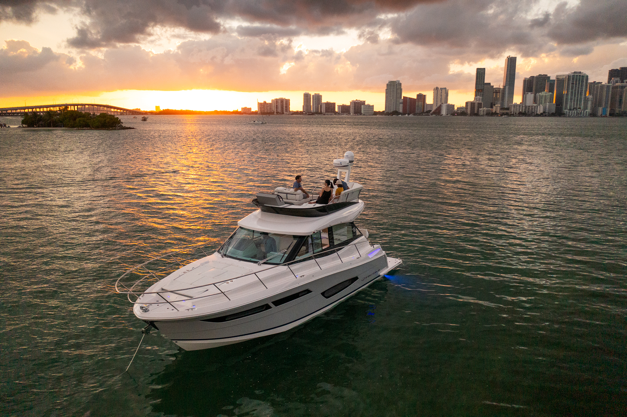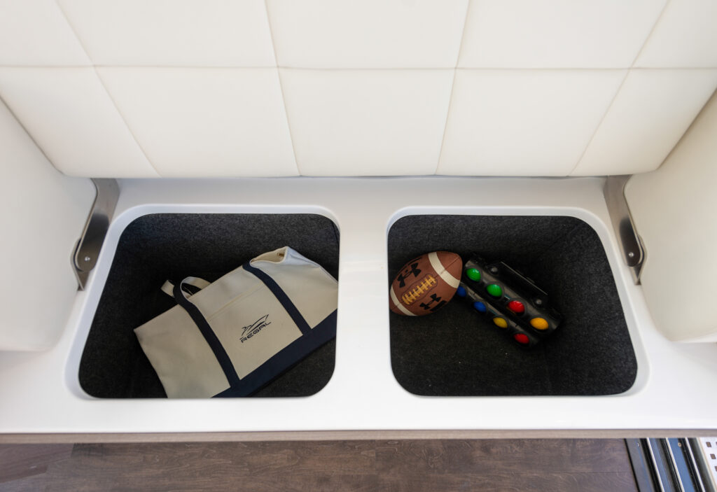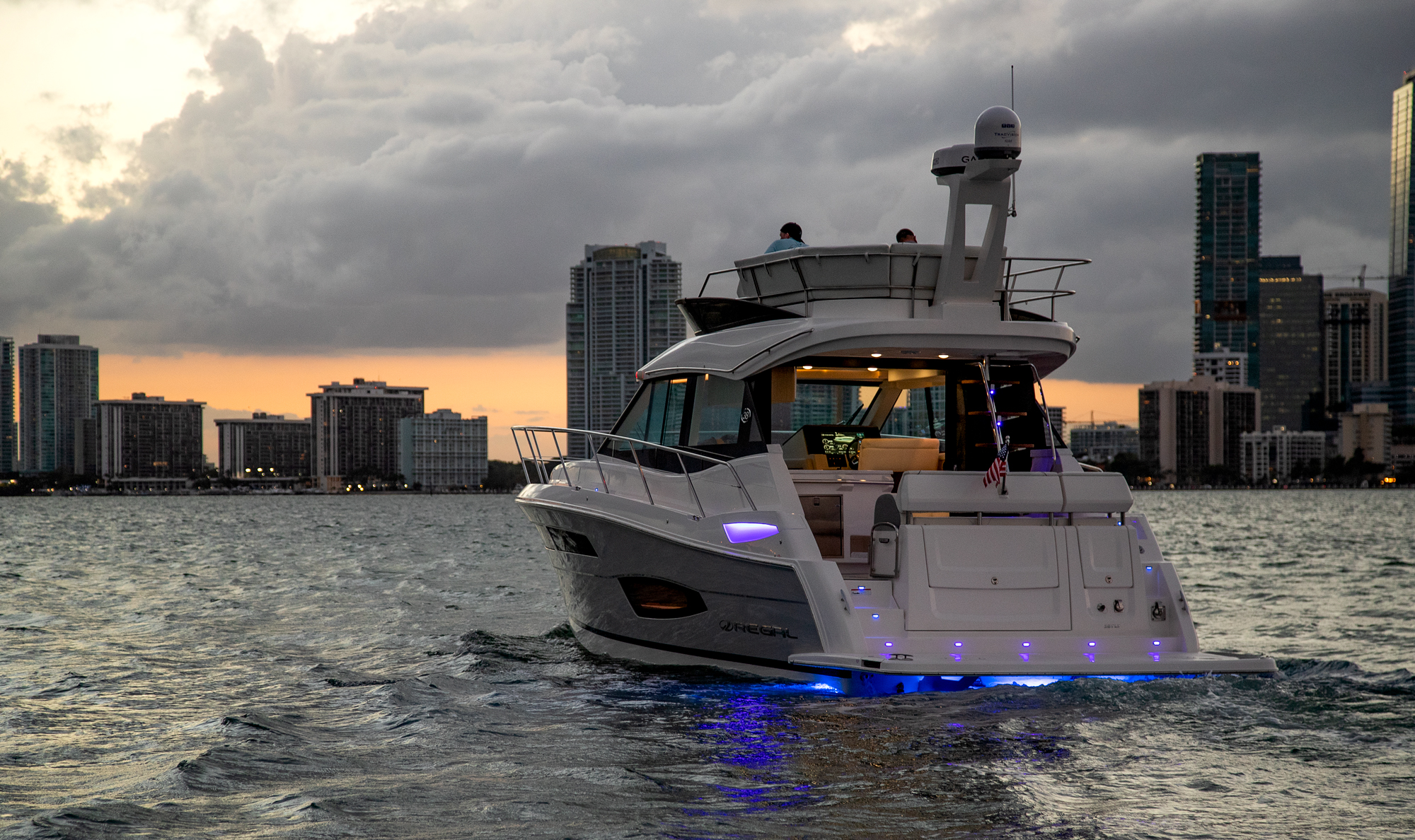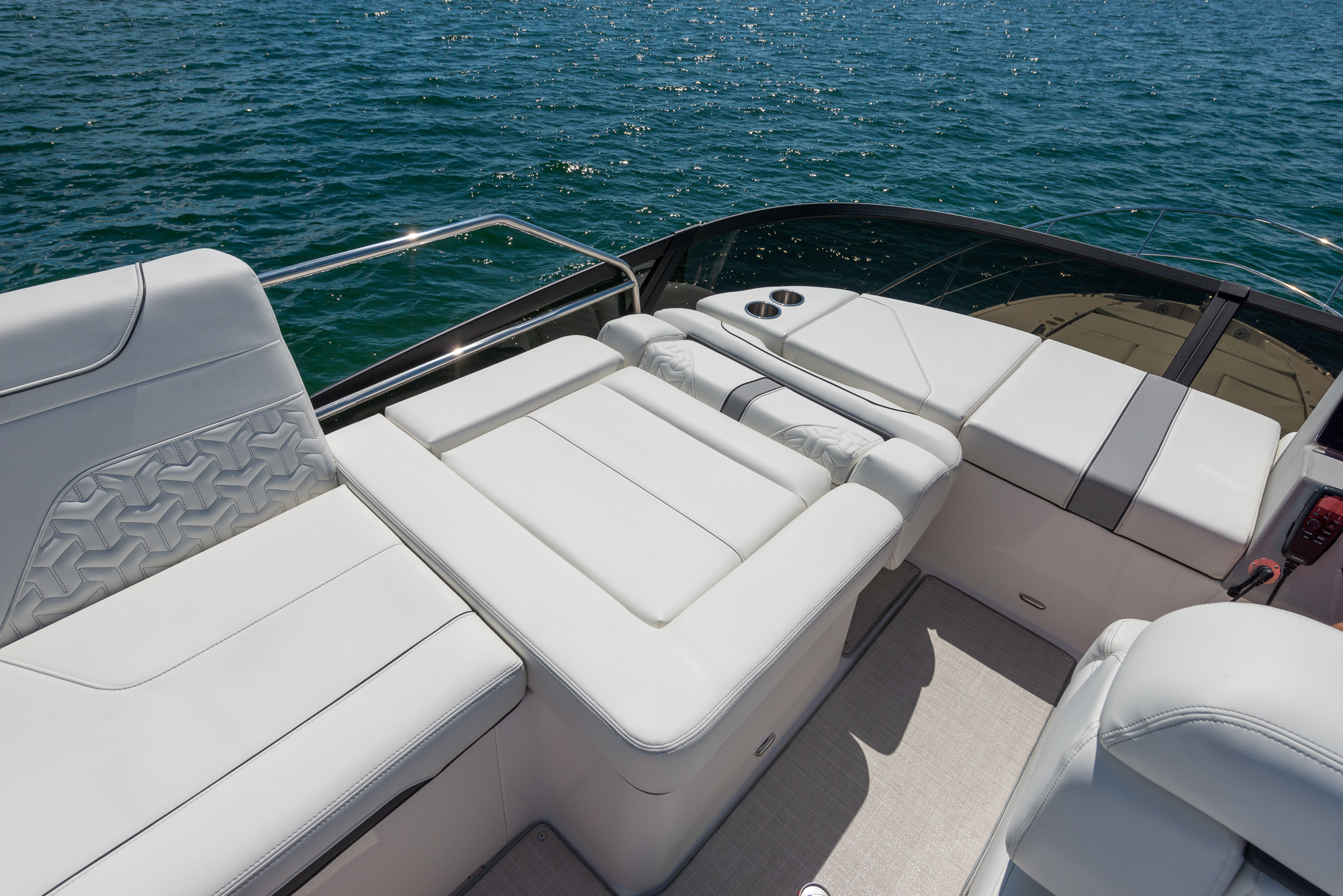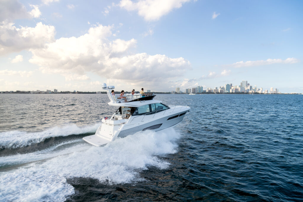 This watercraft, however, is quite a sight in itself. Possessing the curvaceous and streamlined looks that have made Regal Boats so sought-after in recent decades, the 38 Fly combines the latest in modern naval architecture and aerodynamic lines with a harmonious nod to the very best of Regal’s brand heritage. Pick a custom gel-coating to give your vessel a livery in sparkling Tahiti Beach White, or add a shock of color in the form of a Flame Red bootstripe, bound to catch the eye as you cruise.