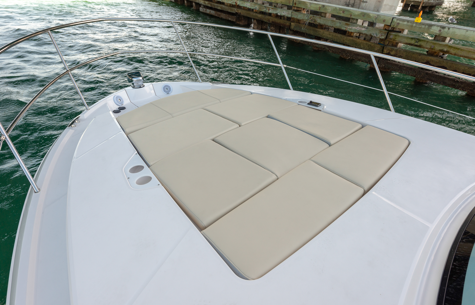 Premier, waterfront real-estate can be found out on the foredeck, where a vast modular sunpad with a series of cushioned panels that can be laid-flat for sunbathing or lifted up to be used as backrests. A Cabana sunshade out here offers guests the opportunity to relax in the shade while soaking up the maritime views, and when a set of forward panels are raised you will enjoy a bijoux, triple-width bow-lounge at the very front of the boat.