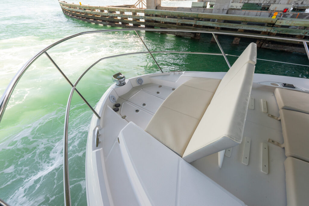 Steer your way to far-flung capes and secret coves at this yacht’s two helm stations, with one perched up on the flybridge for joyous piloting in the sun and another at the front of the main-deck salon for all-weather navigation. A stylish hand-wrapped dashboard features a power-assisted steering wheel, hand-held Garmin VHF, back-lit trim-tab switches, a Penta joystick and bow thruster controls for precise docking, while dual Volvo Glass Cockpit touch-screens bundle next-generation instrumentation in a futuristic, hi-tech package. The helms are linked to your choice of engines with up to 860 units of raw horsepower on offer. Pick between twin 600HP Volvo D4 diesel engines or a twin-set of 860HP Volvo V8 430 EVC2 engines for speeds of up to 40 knots at full-throttle. A 260 gallon fuel tank has been calibrated to keep you out on the water for days on end before requiring a top-up, and at a mid-20 knot cruising pace you will enjoy the sort of exploration you’ve been waiting a long time for.