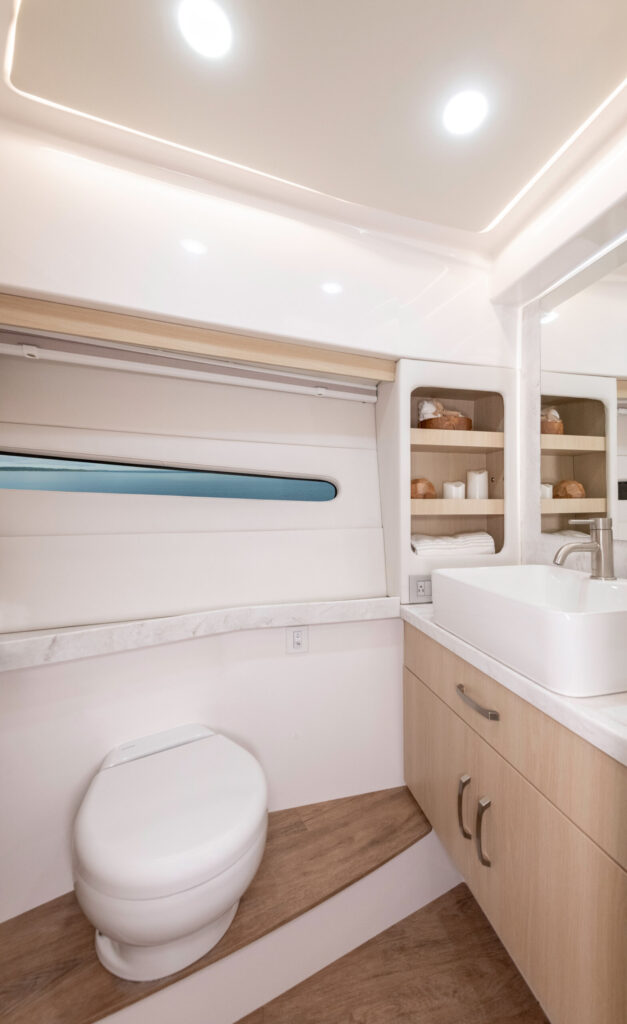 On the lower-deck there are a pair of staterooms for up to four overnight guests, with the master stateroom to the bow impressing with a seductive queen-sized bed, a timber-lined armoire, a skylight and strip hull glazing. A full-beam owner’s stateroom to aft is large enough to fit in a king-sized bed that can also be turned into a pair of twins, while a full-height locker, cushioned wall panels, a side-sofa and a wall-mounted HDTV present an at-home feel. Bathroom facilities on this level are split between a main-head with spa-like dimensions, a ceramic vessel sink, oak surrounds and a double-width vanity mirror and a teak-lined wet-room shower to port.