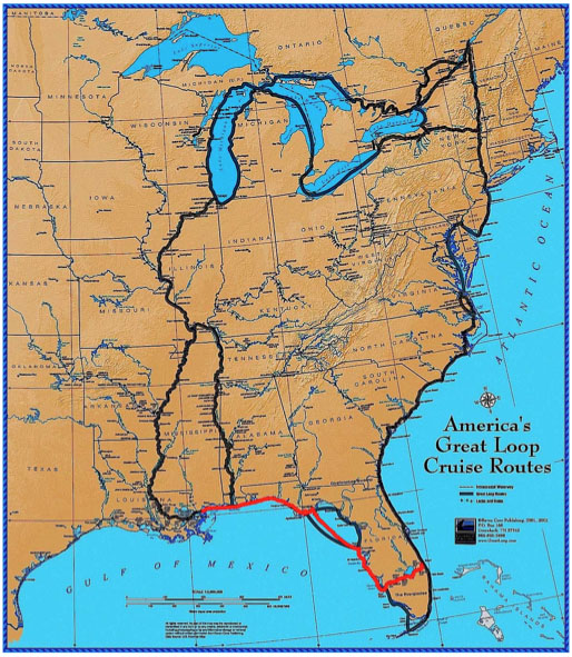 The Great Loop is a +/-6,000 mile boat route that goes up the entire eastern coast of the U.S., via the Atlantic Intracoastal Waterway, then cuts over to the Great Lakes via the Erie Canal (in my case, since I am not doing the Canadian portion of the trip), down the Illinois River to the mighty Mississippi River, then down the Tennessee-Tombigbee Waterway to the Gulf Coast (at Mobile, AL), and back to Florida via the Gulf of Mexico — ending in Naples, my starting point.