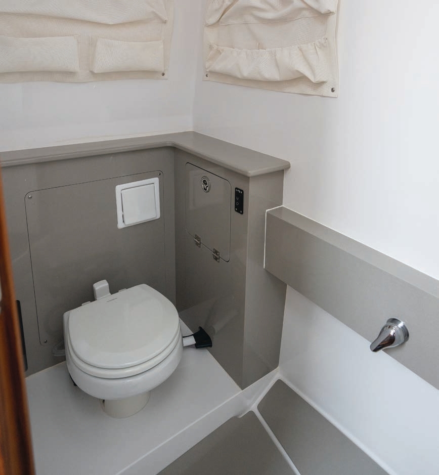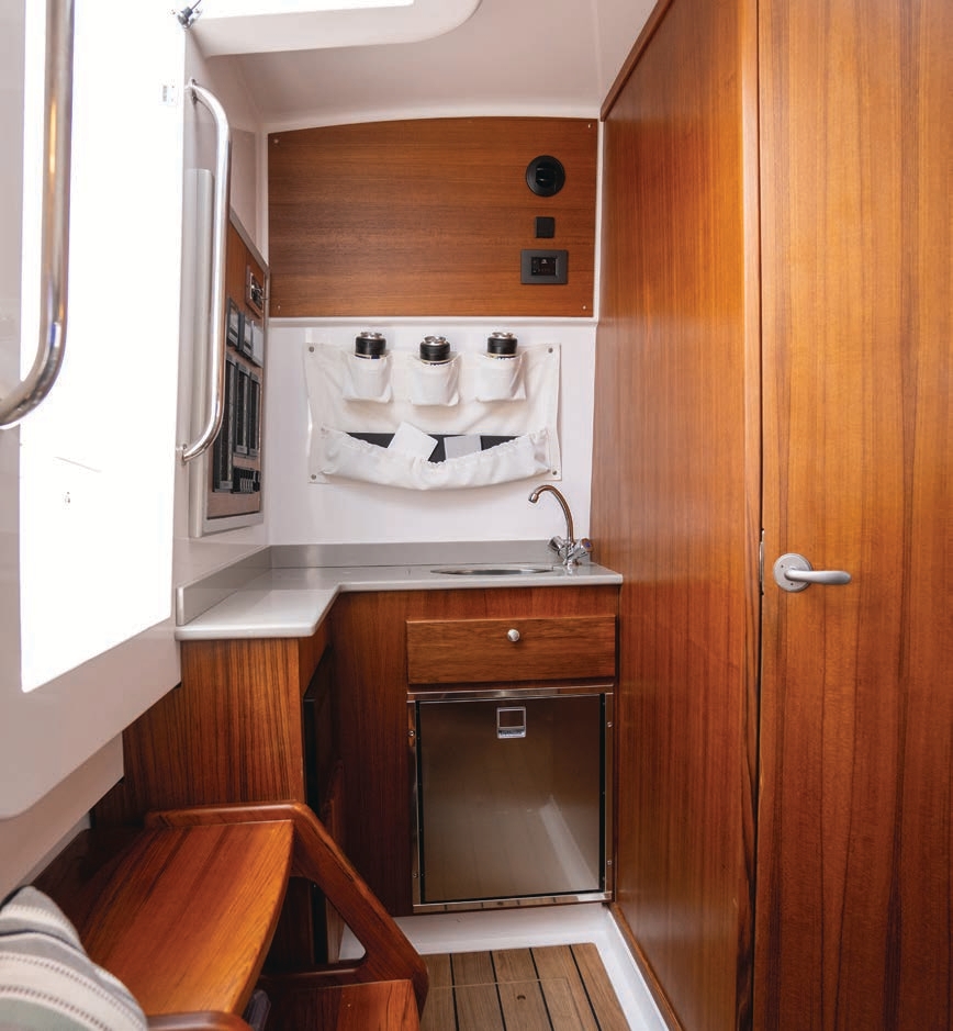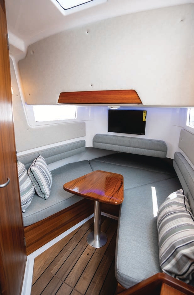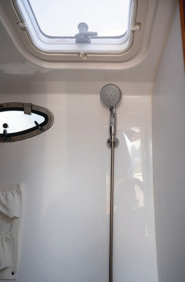 Get out of the sun in the luxurious air-conditioned cabin. Featuring real teak throughout, soft headliner accents, television, reading lights, spacious galley, private head with stand-up shower.